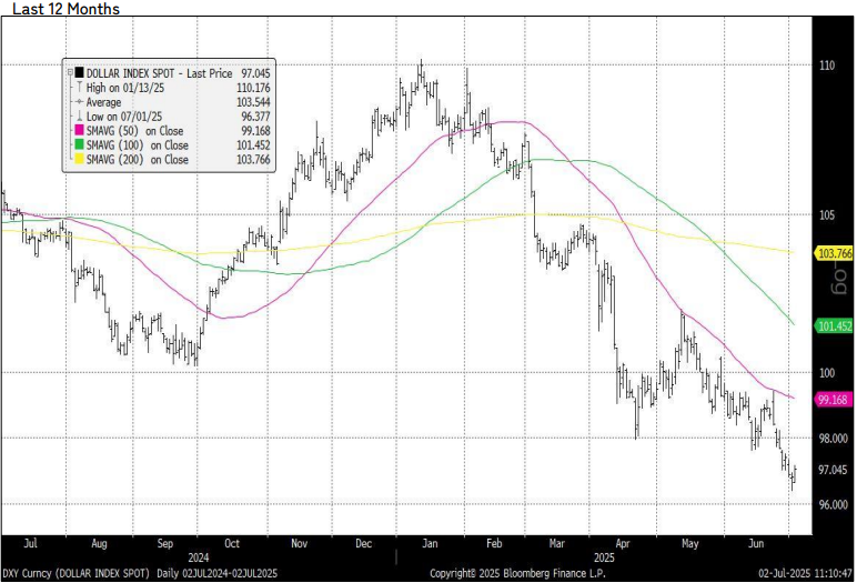 In April investors were concerned that tariffs may lead to stagflation, a condition detrimental to the market value of financial assets. Although consumer spending has become increasingly selective, it is not declining. In the absence of an increase in business inventory levels, it is premature to forecast a recession. As for inflation, the Personal Consumption Expenditures Price Index (PCE) rose 2.3% year-over-year in May and is approaching the Fed’s annualized target of 2%. Fed Chair Powell stated in Congressional testimony they expect the effect of tariffs on prices will be reflected by July, leading to speculation the Fed will consider an interest rate cut in their September meeting if prices remain stable. Investors have become more sanguine on inflation fears, as evidenced by the recent drop-in interest rates. Although private payrolls unexpectedly declined in May, the unemployment rate remains at the lower end of the historical range, at 4.1%. For this reason, we do not expect the Fed to take any action on interest rates at their July meeting.