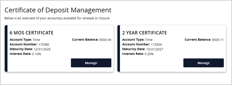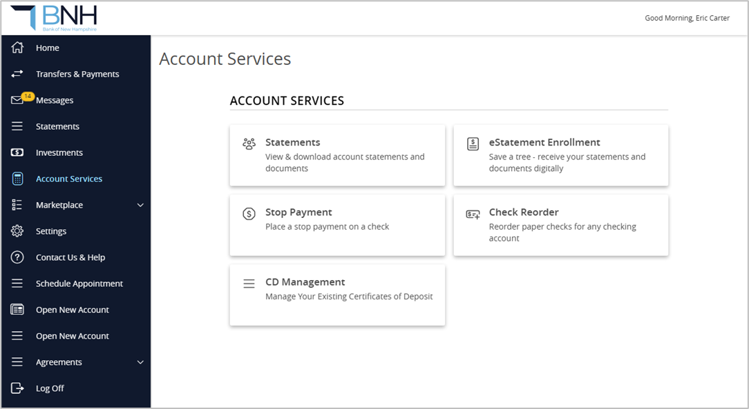 1. Within Online/Mobile Banking, click Account Services from the menu and then CD Management.