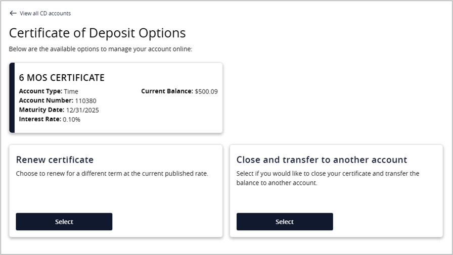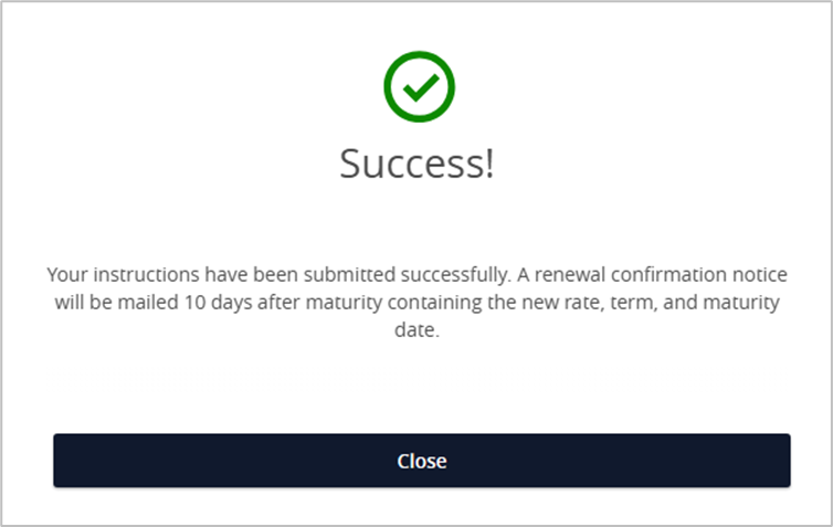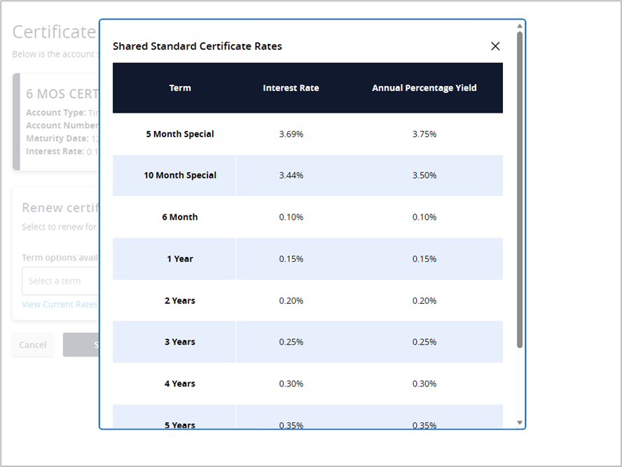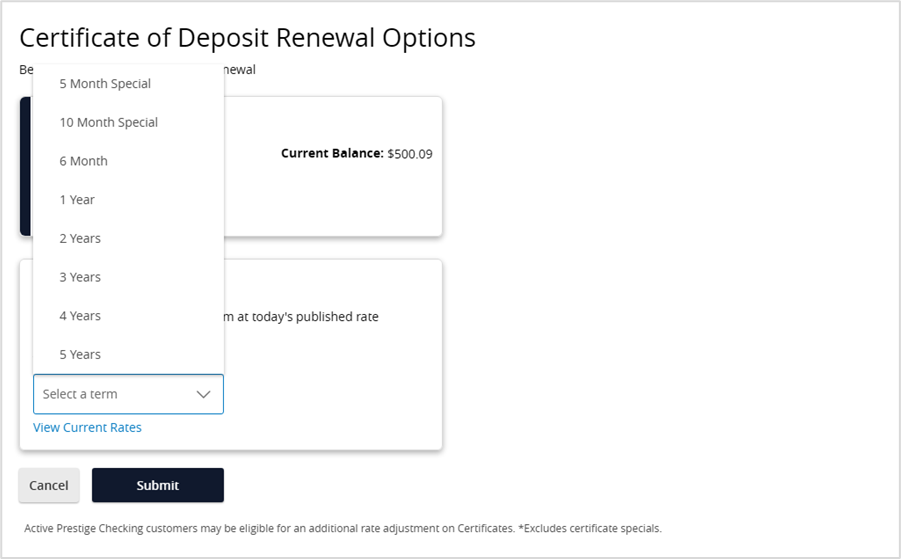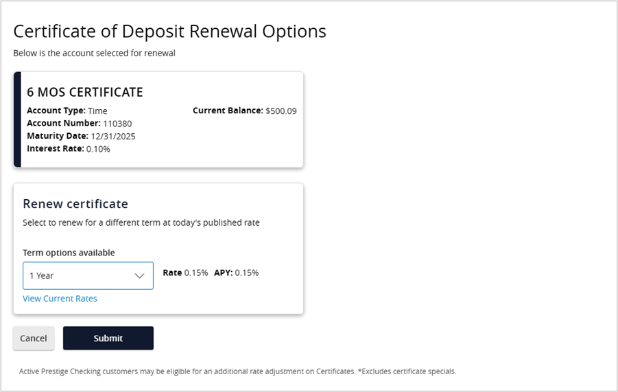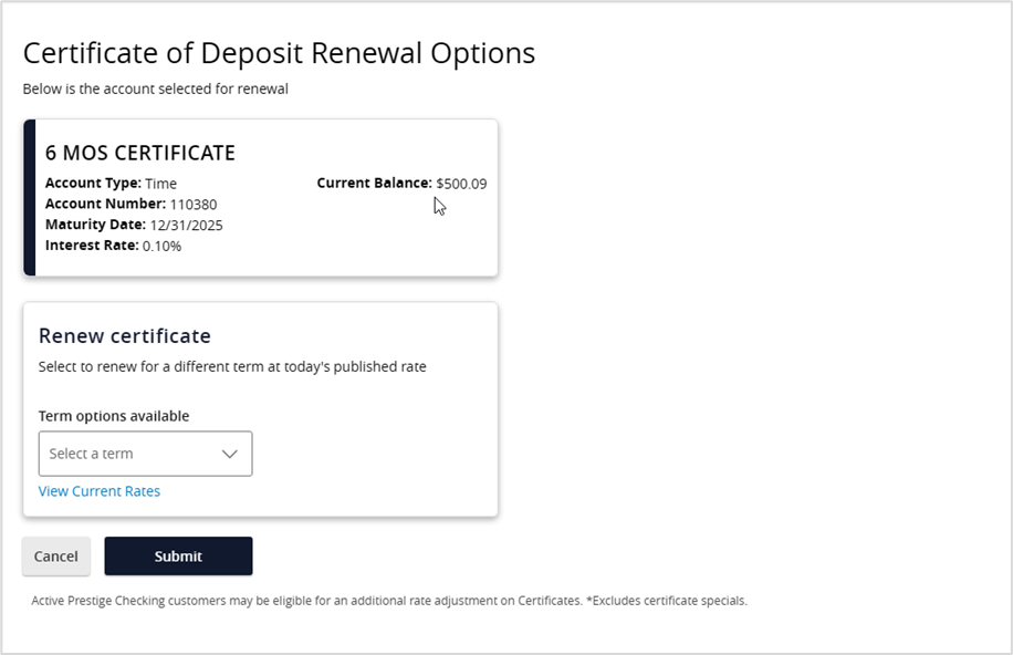 6. Once the term is selected, the Rate and APY will display. Clicking Submit will send the request for renewal.